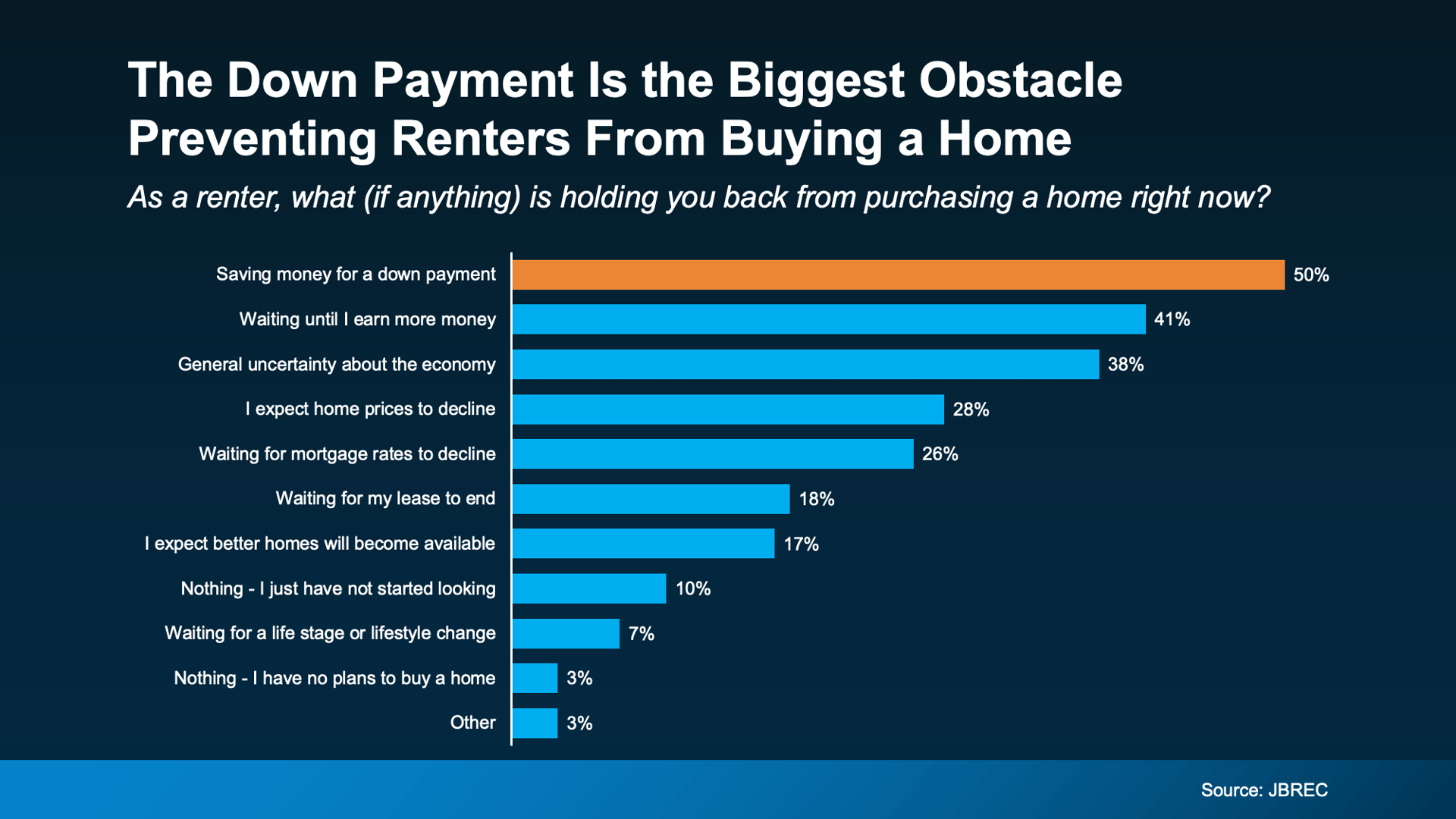 When John Burns Research & Consulting (JBREC) asked renters what’s keeping them from buying, the top answer wasn’t mortgage rates or home prices. It was the upfront cost, particularly saving enough for their down payment (see graph below):